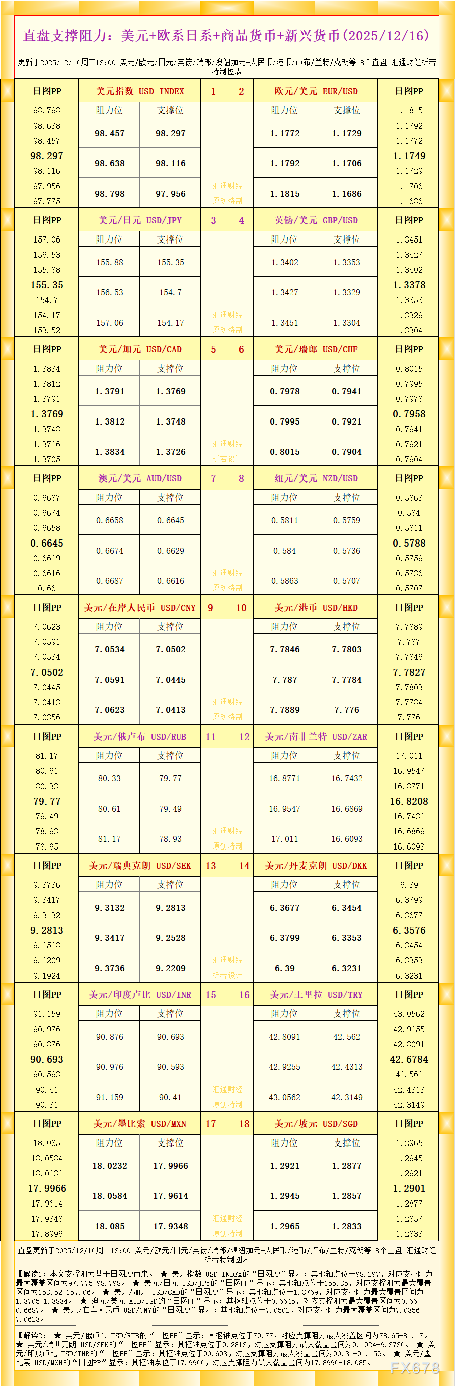 汇通财经APP讯——一张图看直盘支撑阻力:美元+欧系日系+商品货币+新兴货币,更新于2025年12月16日周二13:00,具体美元/欧元/日元/英镑/瑞郎/澳纽加元+人民币/港币/卢布/兰特/克朗等18个直盘,更多详见汇通财经析若特制图表中的内容。
